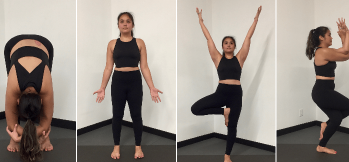 Similar to Ragdoll, standing in this pose causes you to be aware of any tilting or unevenness. Maintain your spine long, core activated, and shoulders relaxed. Check if one side of your body is heavier or lifted. - Tree Pose: